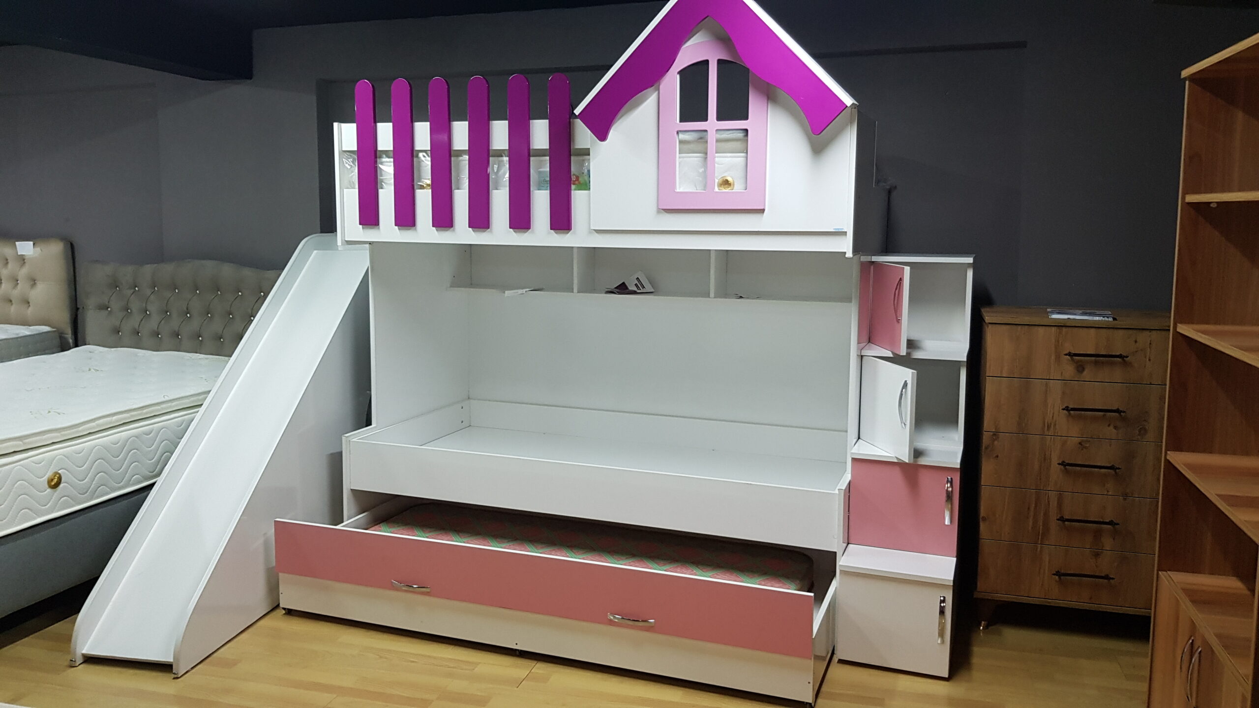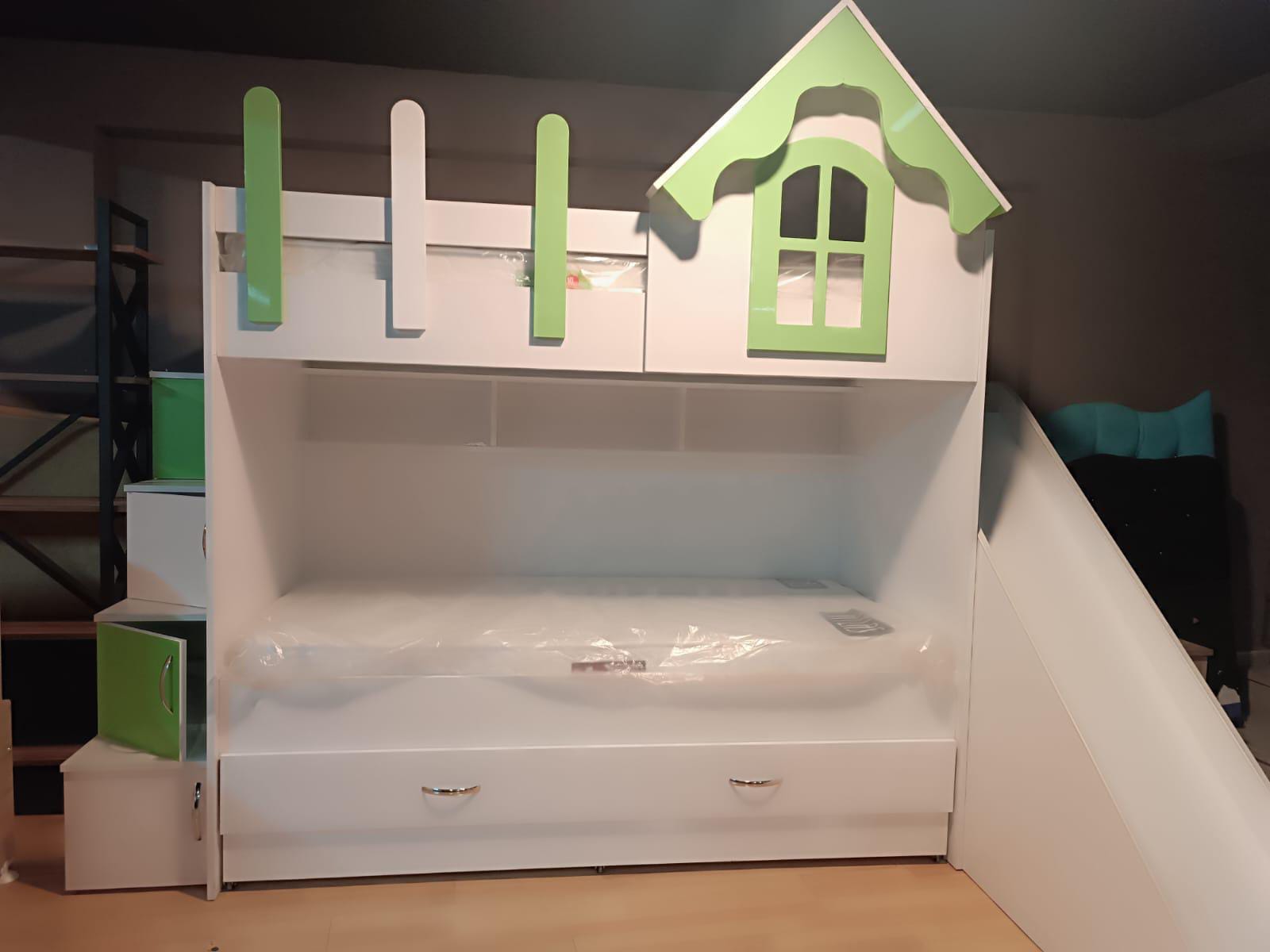 Yatak ölçüsü 90 x 190 yatak sayısı 3 Adet olup, Kaydırağı ile çocuklara bir eğlence ve kaydırak iç kısmına çocukların oyuncaklarını koyma yeri mevcut olup, 4 Adet Dolaplı basamağı, Ranza içinde kitaplığı mevcuttur. Ranzanın 210 cm yüksekliği, 200 cm genişliği ve 98 cm derinliği ile geniş bir uyku alanı sunar. Ürünün toplam taşıma kapasitesi 100 kg. olup, güvenlik standartlarına uygun olarak tasarlanmıştır.